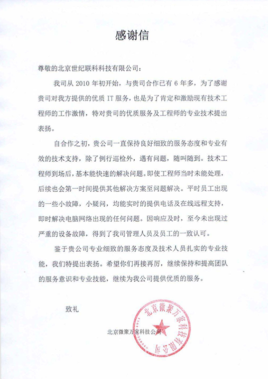 自合作之初,貴公司一直保持良好細致的服務(wù)態(tài)度和專業(yè)有效的技術(shù)支持,除了例行巡檢外,遇有問題,隨叫隨到。技術(shù)工程師到場后,基本能快速的解決問題。即使工程師當時未能處理,后續(xù)也會第一時間提供其他解決方案至問題解決。平時員工出現(xiàn)的一些小故障,小疑問,均能實時的提供電話及在線遠程支持,即時解決電腦網(wǎng)絡(luò)出現(xiàn)的任何問題。因響應(yīng)及時,至今未出現(xiàn)過嚴重的設(shè)備故障,得到了我司管理人員及員工的一致認可。